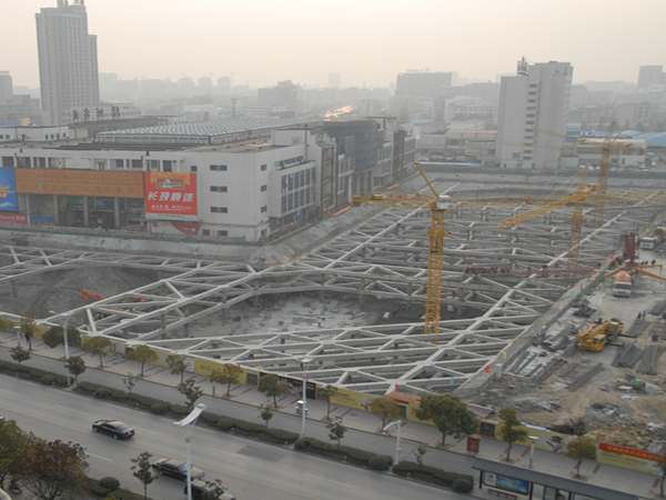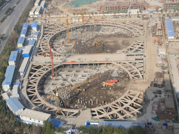支護型式:基坑采用鉆孔灌注樁加一道砼水平支撐進行支護,支撐體系采用一大一小雙環,大環直徑達128m,雙環之間設置棧橋方便土方運輸。采用雙軸深攪樁止水,深坑部位布設降壓井,淺坑布設疏干井。圓環支撐具有剛度大,挖土空間大的特點,節約造價約300萬且縮短了工期約3個月,取得了良好的社會經濟效益。