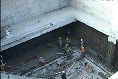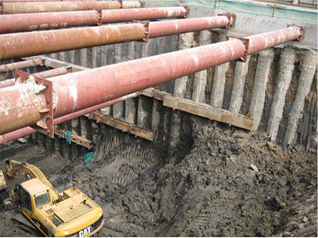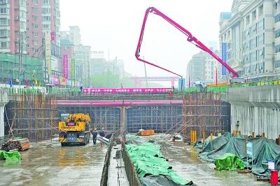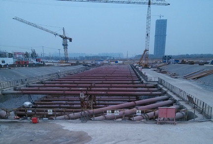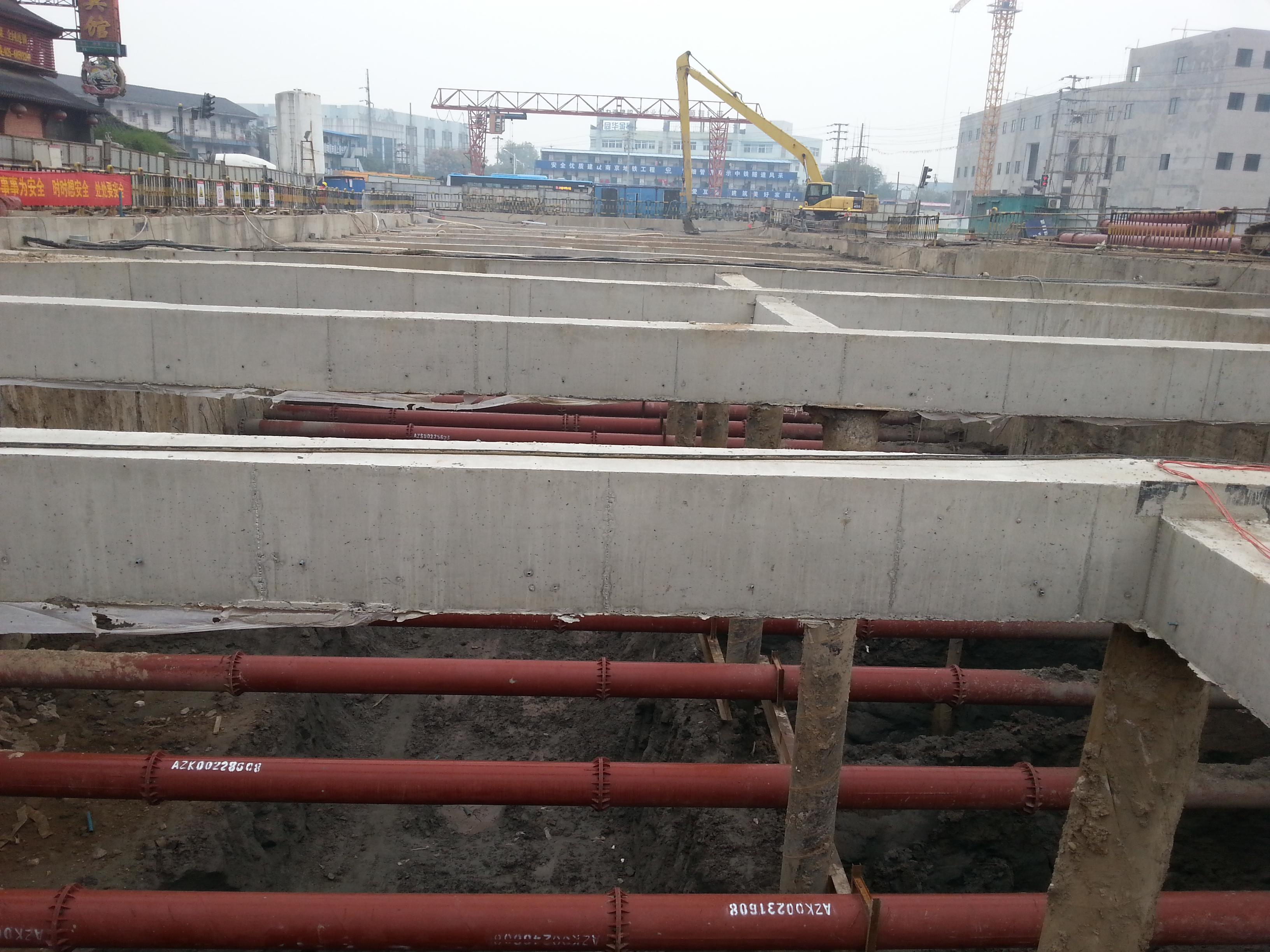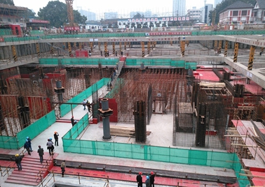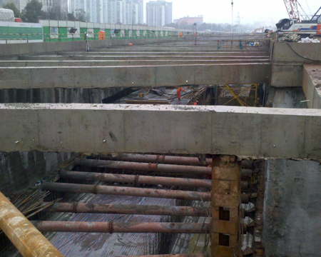 杭州地鐵一號線武林廣場站是地鐵1號線與3號線換乘站,車站為4柱5跨三層結構,長161m,埋深28m,施工工藝為蓋挖逆做法施工,其基坑圍護結構是地下連續墻,并與主體結構的側墻組成疊合墻作為永久結構的墻體。工程技術人員成功開發應用了“超寬超深地下連續墻施工工法”和“蓋挖地鐵車站液壓垂直插入鋼管柱施工工法”,取得了很好效果。